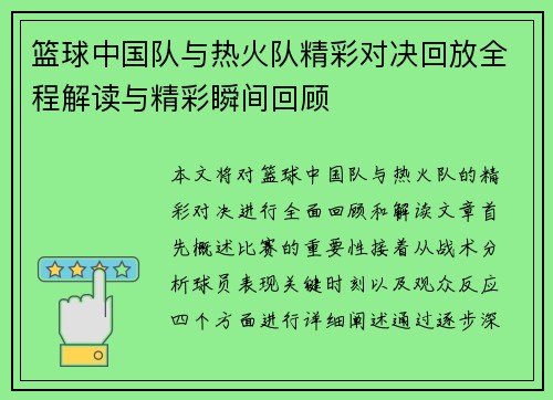 本文将对篮球中国队与热火队的精彩对决进行全面回顾和解读。文章首先概述比赛的重要性,接着从战术分析、球员表现、关键时刻以及观众反应四个方面进行详细阐述。通过逐步深入的分析,我们将看到这场比赛中各方力量的碰撞,以及在这一过程中所展现出的精彩瞬间。此外,还会探讨比赛对于中国篮球发展的意义,并展望未来的发展...